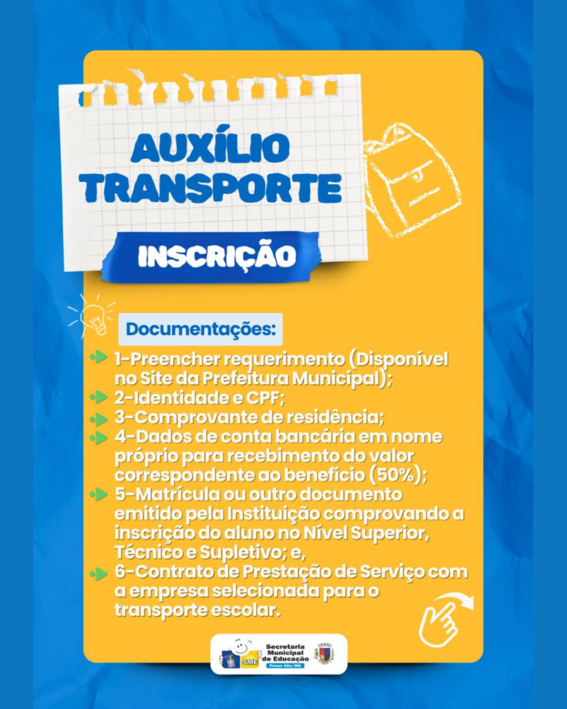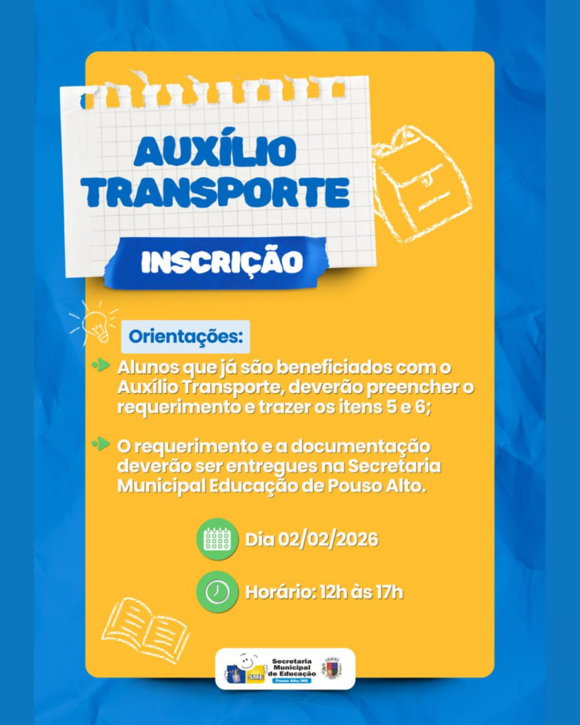 A Prefeitura de Pouso Alto, por meio da Secretaria Municipal de Educação, informa que estão abertas as inscrições para o Auxílio Transporte 2026, destinado a estudantes que realizam cursos fora do município.